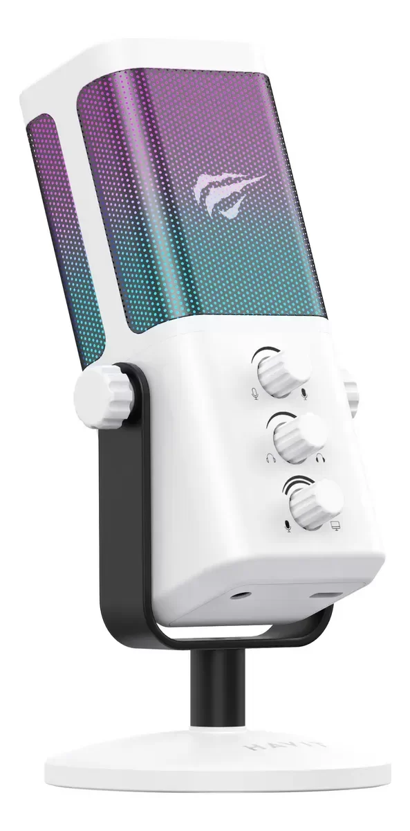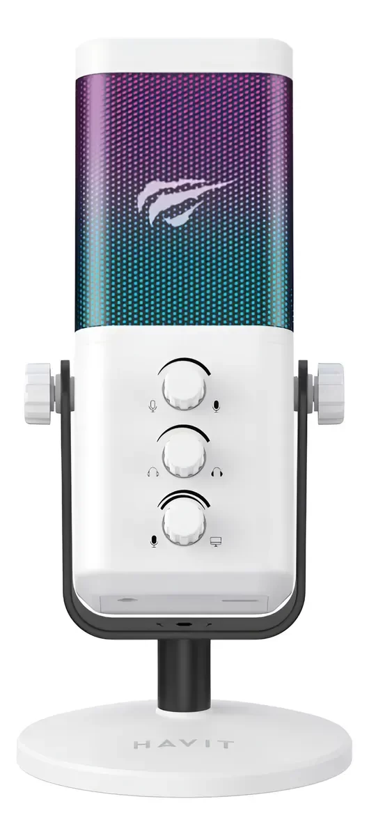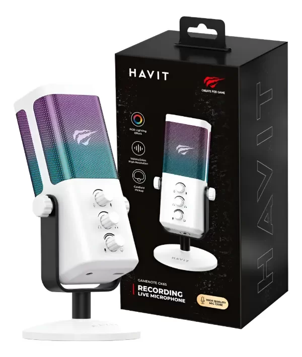 El Havit GK65 es un micrófono gamer diseñado para ofrecer una calidad de sonido dentro de tu setup. Características principales: Micrófono ideal para gaming, streaming y grabaciones. Iluminación LED RGB con diferentes gradientes y colores plenos para que conviene a tu agrado. Recepción de sonido cardioide que capta tu voz y reduce el ruido de fondo. Controles integrados de fácil acceso. Acceso rápido para silenciar y activar la función de reducción de sonido. Base estable para escritorio y con la capacidad de usarlo en brazos para micrófonos Conexión versátil mediante USB Tipo-C y jack 3.5 mm. Ficha técnica: Tamaño: 85 × 85 × 200 mm Peso: 335 g Señal de ruido: 80 dB Voltaje: 5V Corriente: 150 mA Frecuencia de respuesta: 70 Hz – 16,000 Hz Dirección: Cardioide Material: Plástico con red metálica Interfaz: Jack 3.5 mm y USB Tipo-C Iluminación: LED RGB